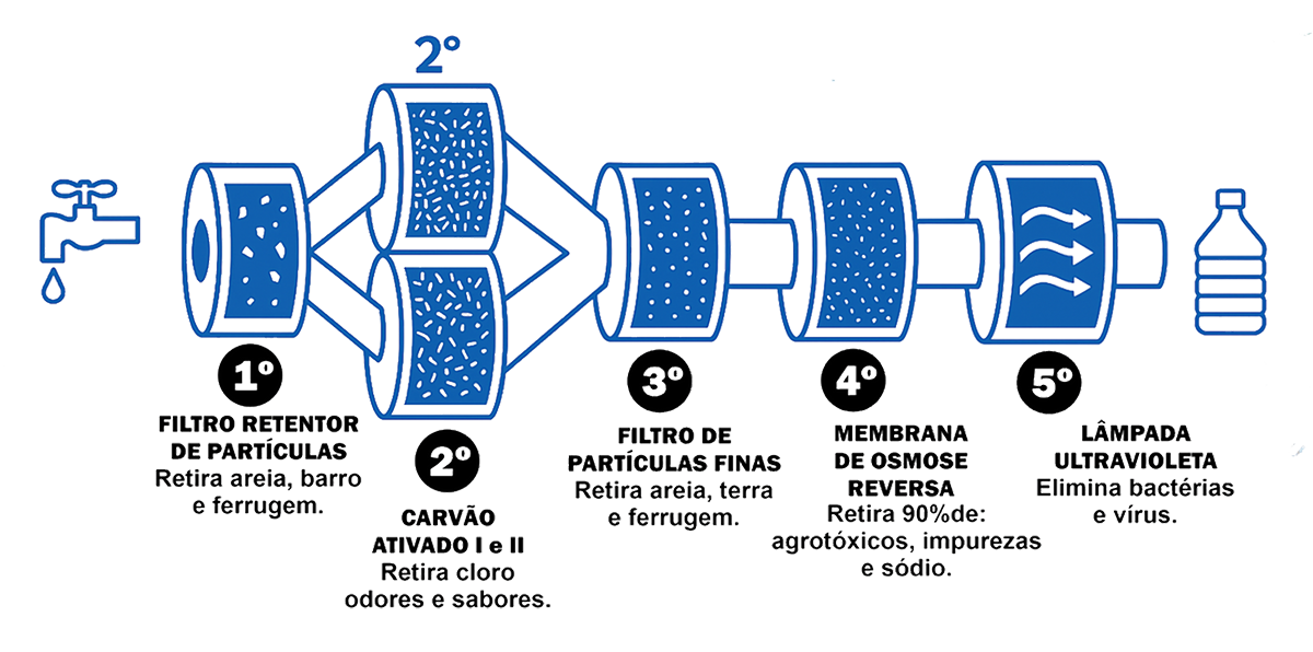 O purificador abastece galões de até 20 litros e possui 5 estágios de purificação da água que remove: